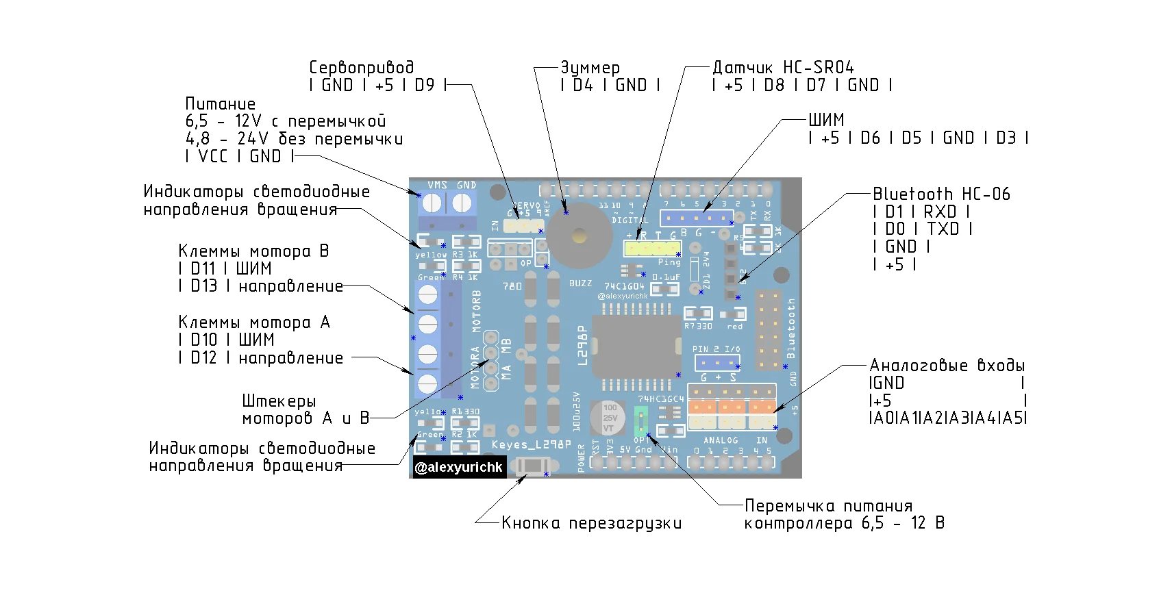 - На плате используется микросхема драйвера двигателей L298P, поэтому вы можете использовать цифровой интерфейс ввода/вывода (D10, D11, D12, D13) без дополнительных сложных схем подключения.
