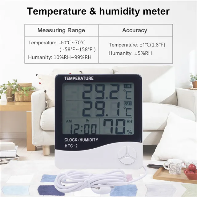 LCD Digital HTC-2 Thermometer Hygrometer Weather Station Wireless Temperature Humidity Tester Indoor Outdoor Probe Clock Alarm - Купить с бесплатной доставкой