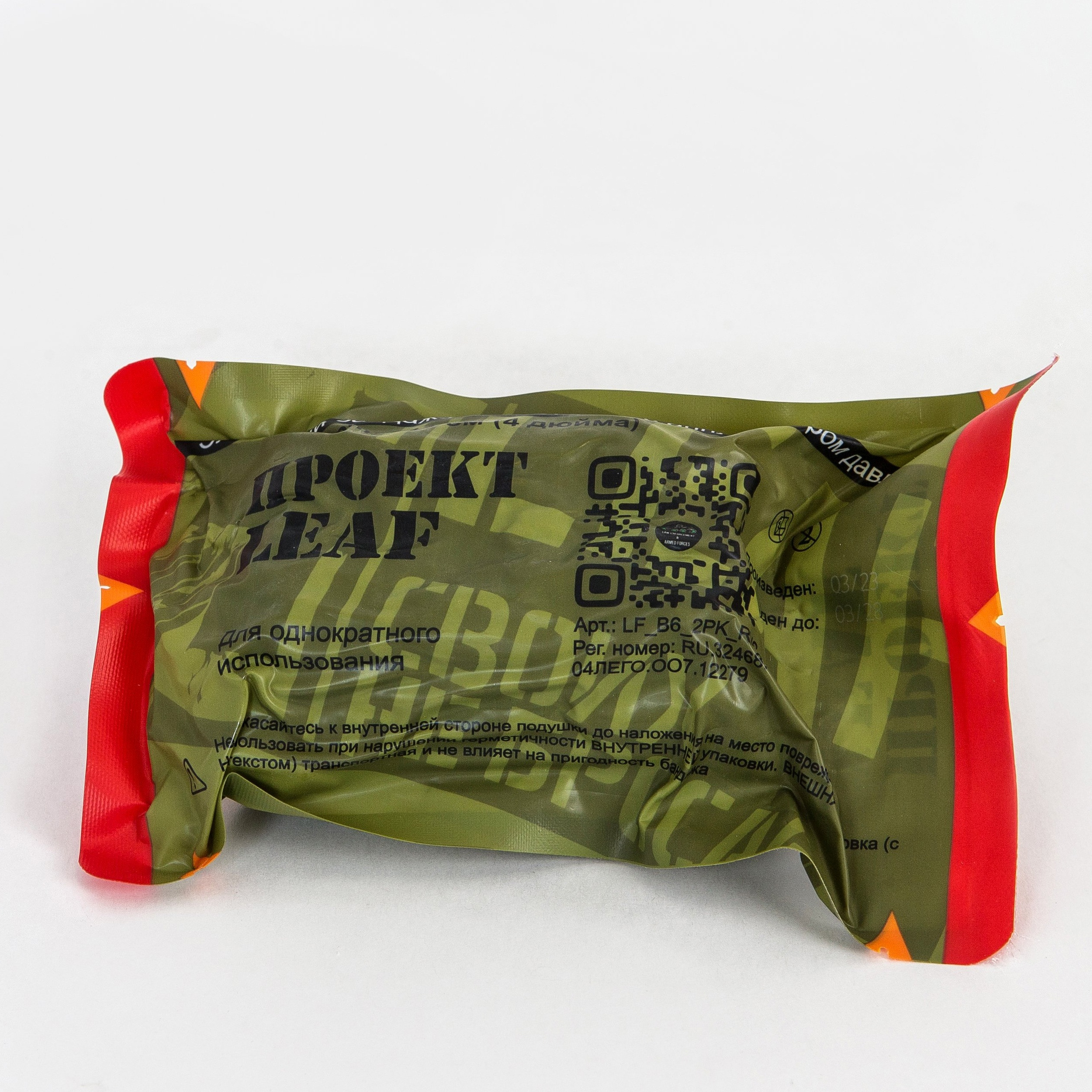 Бандаж в вакуумной упаковке с маркировками "BLOODPACK" и "Проект LEAF" предназначен для тренировки навыков оказания первой помощи при массивном кровотечении, где данное изделие используется в качестве давящей повязки и негемостатического материала для тампонирования раны.