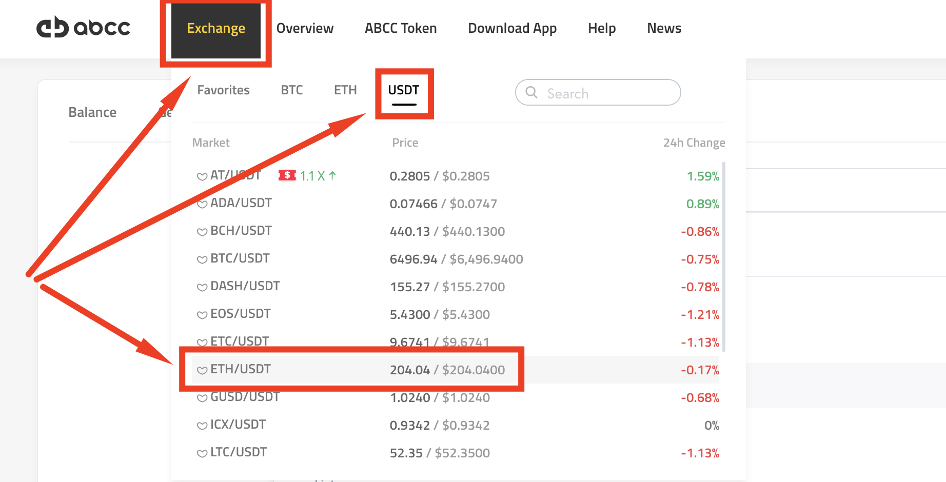 Дальше ваша задача зайти в торги (Exchange) и открыть пару ETH/USDT
