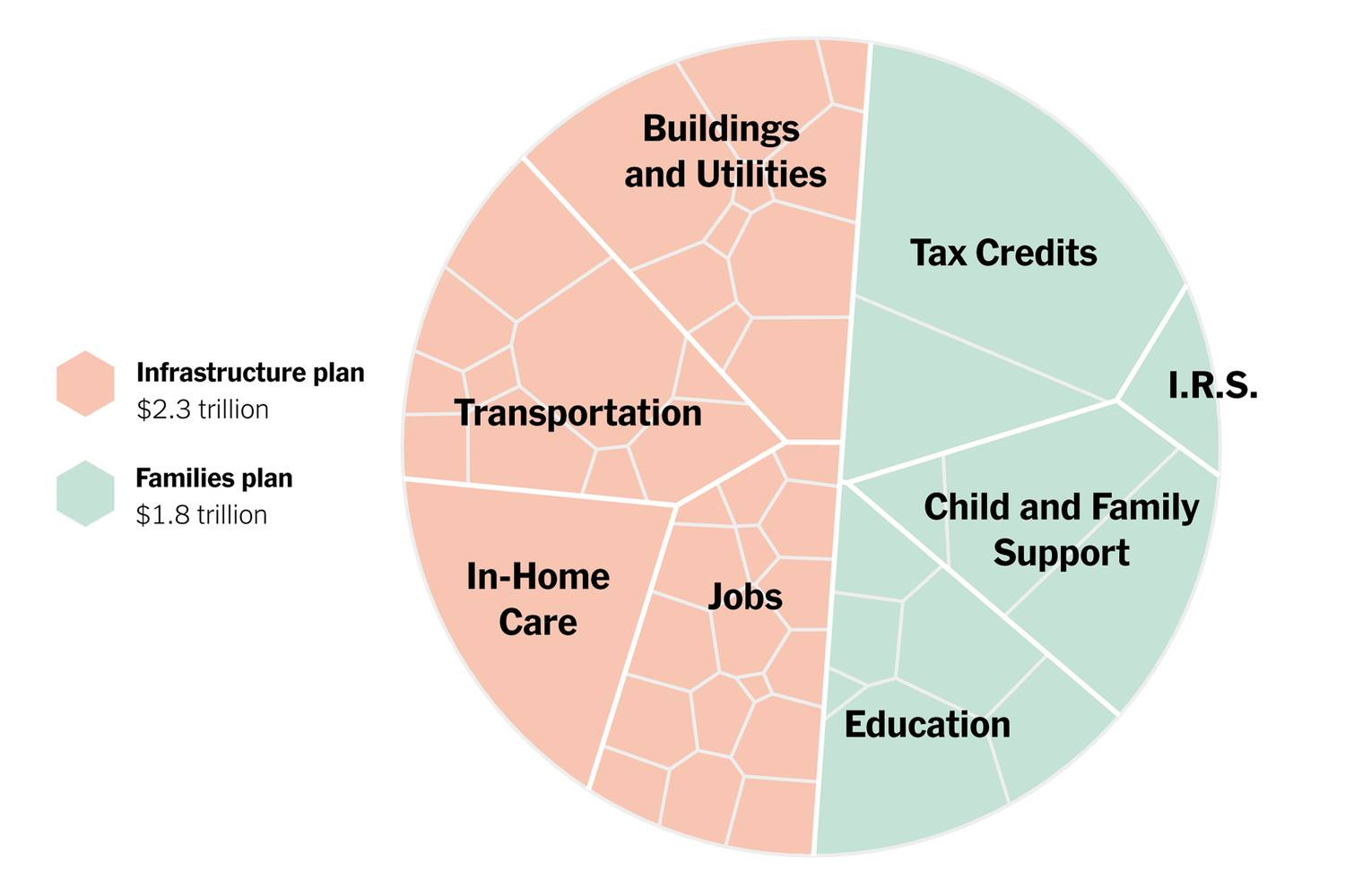 Когда в январе, до вступления Байдена в должность, я прогнозировал его ближайшую повестку, она выглядела так: 2-триллионный "антикризисный" пакет, с масштабной прямой помощью всем, кроме богатых, потом 500-миллиардный "инфраструктурный" пакет и потом ещё один, тоже 500-миллиардный. Антикризисный пакет принят (и годовые темпы роста в первом квартале 2021 - 6,4%), и он настолько популярен среди граждан, что следующие два пакета - тоже по 2 триллиона! Инфраструктурный включает в себя всю мыслимую "инфраструктуру", плюс "зеленая перестройка" (обозначенная словом Jobs), плюс 400 миллиардов на перестройку поддержки бедной старости. А следующий, два триллиона, включает бесплатный детский сад, финансируемый из федерального бюджета, увеличение оплачиваемого отпуска и бесплатный бакалавриат (высшее образование) для всех желающих. И просто трансферы работающим малоимущим (категория обозначена Tax Credits).