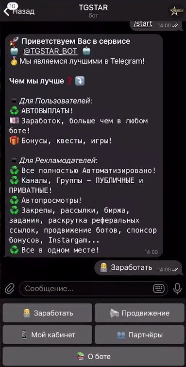 TGSTAR Bot — бот для заработка и продвижения в Телеграме. Место где при переходе на другого бота, подписке на канал, вступлении в группу вы получаете оплату.