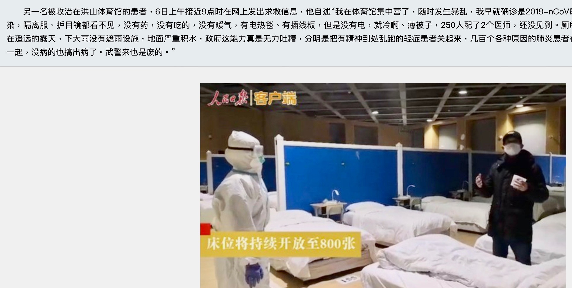 請大家看一下所謂的方倉的場景。這那是什麼醫院,它就是一個輕度患者的臨時隔離所。那根本就是一个让这些病人集体毁灭的场所。
