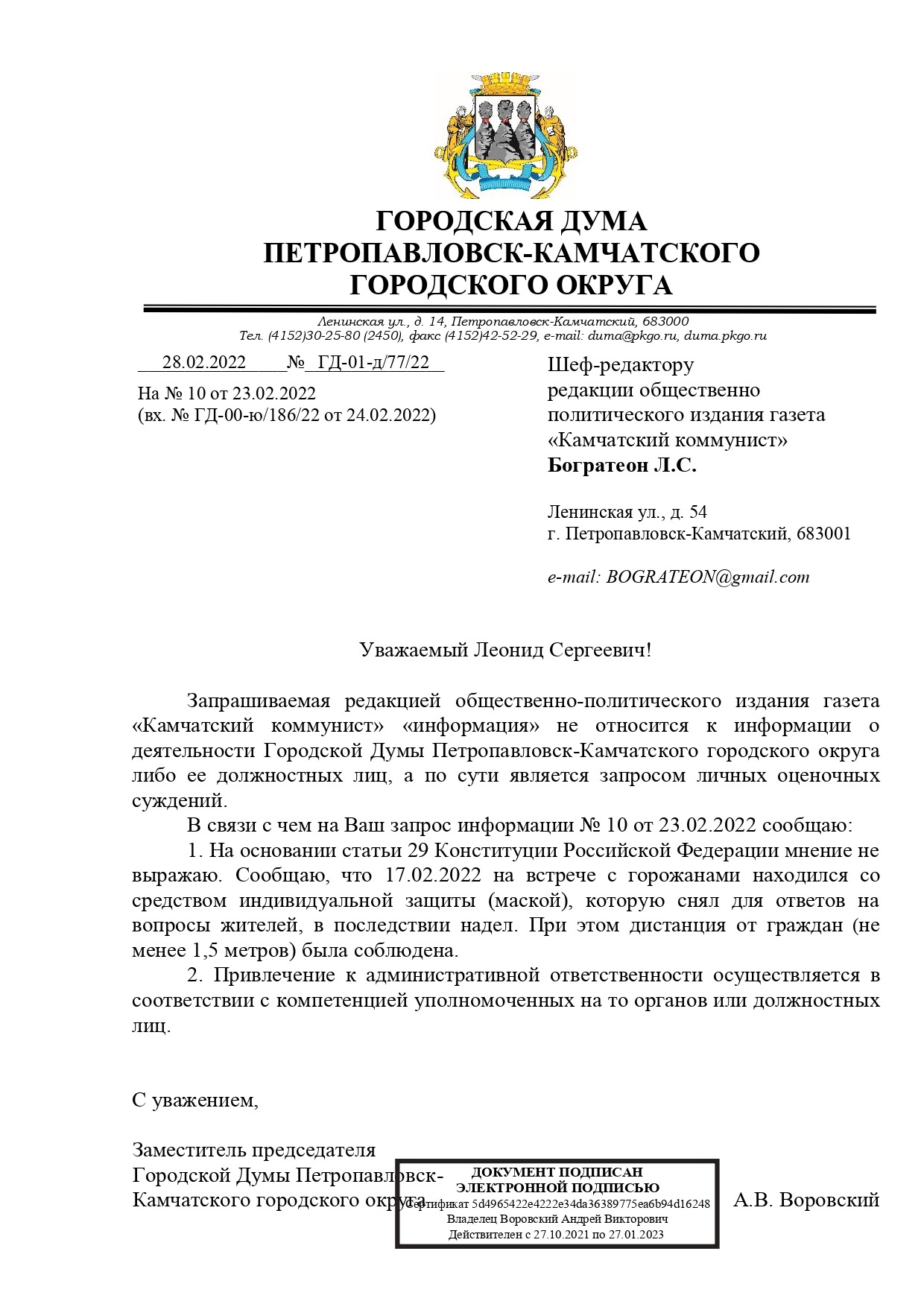 На выше обозначенной встрече оба заместителя председателя Городской думы, депутат Прудкий и Воровский демонстративно, в нарушение постановления Губернатора Камчатского края не использовали средства индивидуальной защиты (маска), а также не соблюдали социальное дистанцирование (1,5 метра), что в свою очередь подтверждается размещёнными на официальном сайте Городской думы фотографиями 18.02.2022 года в разделе «Новости».