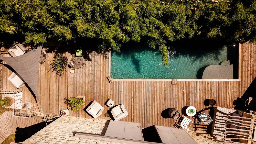 Pornographie publique avec une brune sexy au bord de la piscine