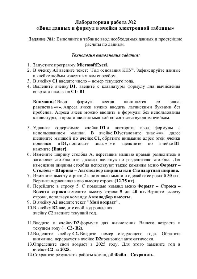 Лабораторная работа 7 Табличный редактор Текстовые формулы . . .