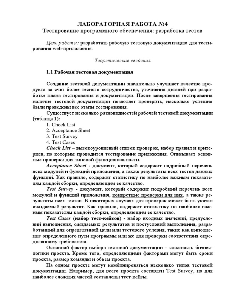 ЛАБОРАТОРНАЯ РАБОТА №4 Тестирование программного обеспечения: разработка тестов Цель работы: разработать рабочую тестовую документацию для тести-рования …