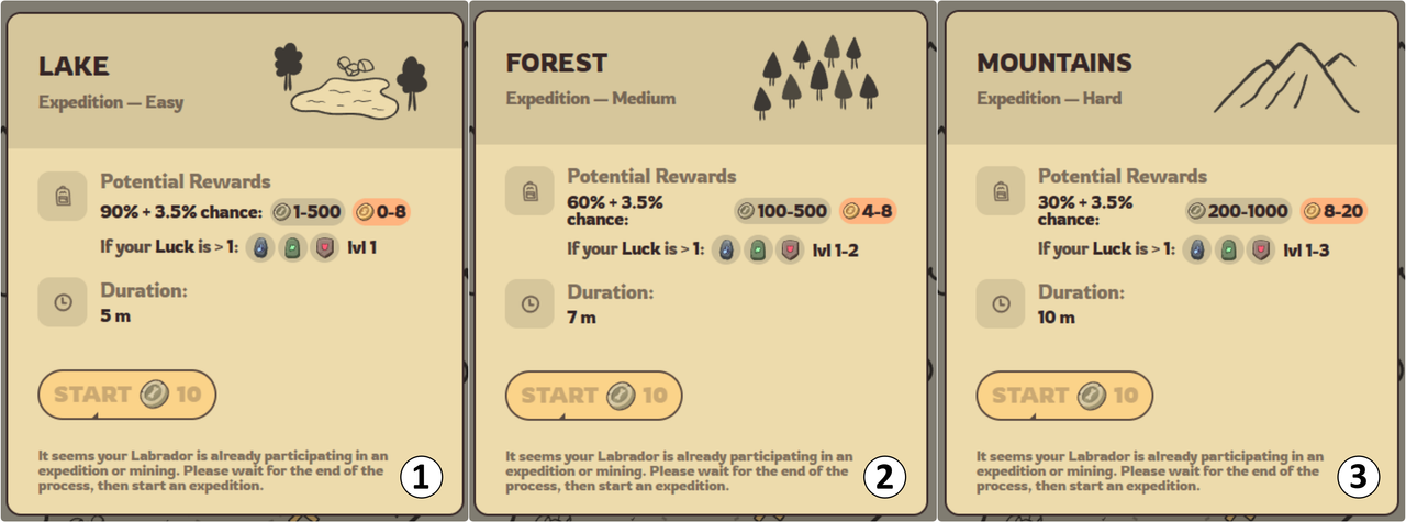 - Mining Speed — increases the speed at which your Labrador digs: +1% speed per level