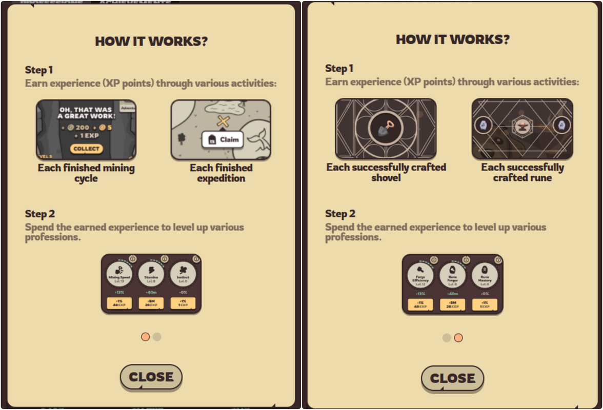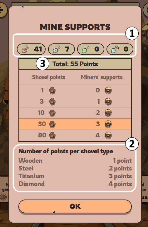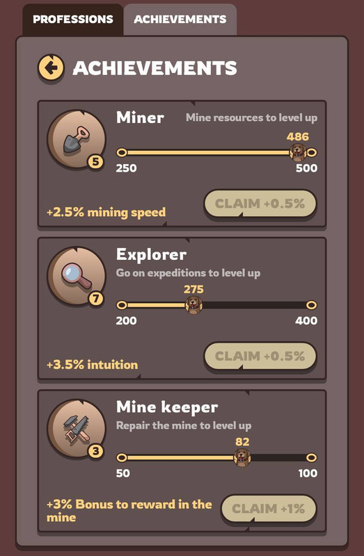 - Miner — increases digging speed. Progresses with each mining session in the main mine. 1 session = 1 point