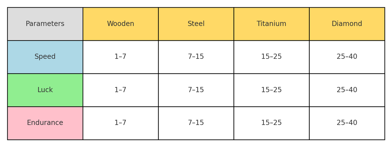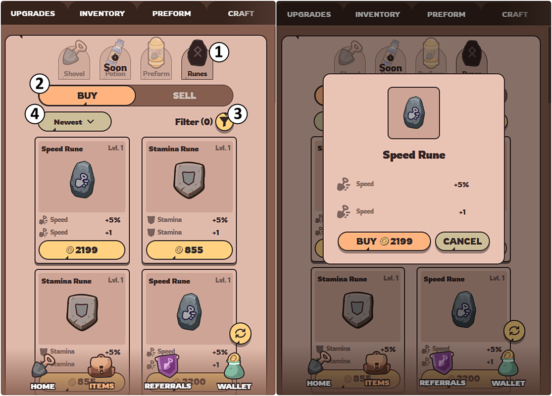 - Runes can be inserted into the shovel and enhance its attributes (Speed, Luck, Endurance).