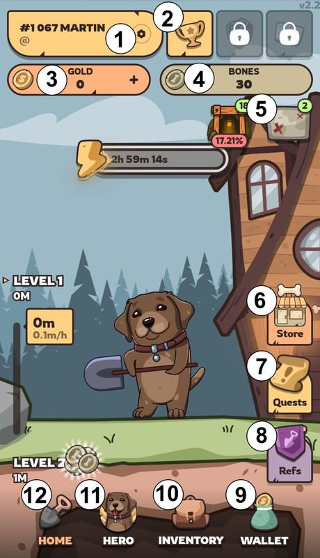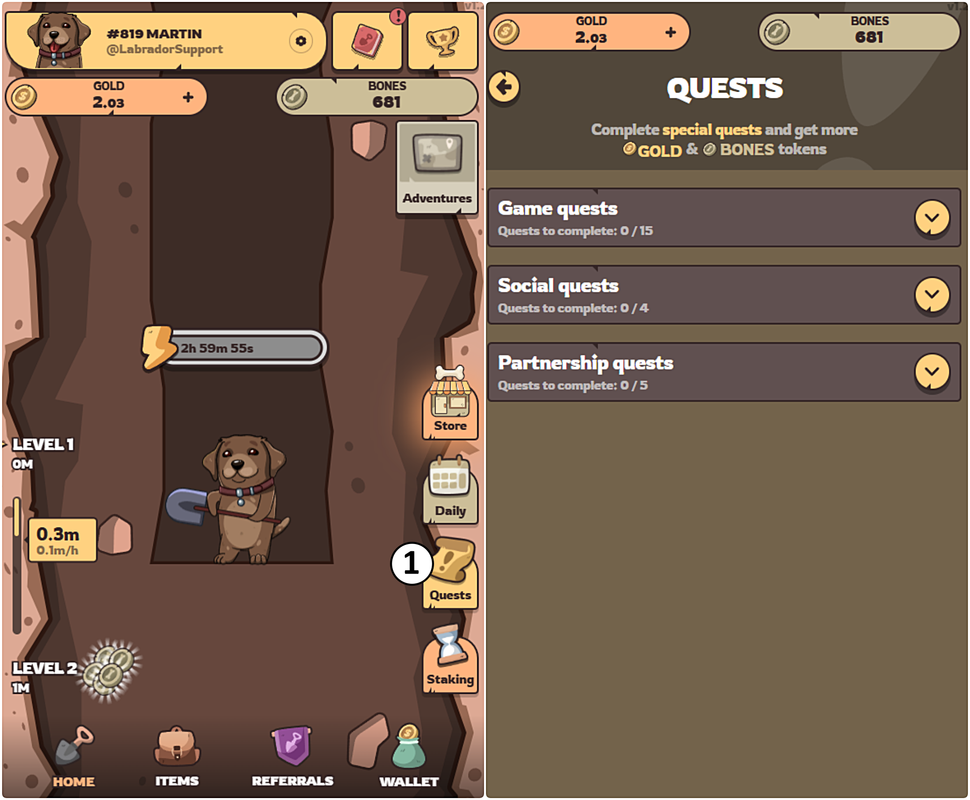 Go to the Quests section (1). There you'll find simple tasks that will guide you through the game mechanics and help you get familiar with them. Completing these quests will reward you with extra Bones and Gold.