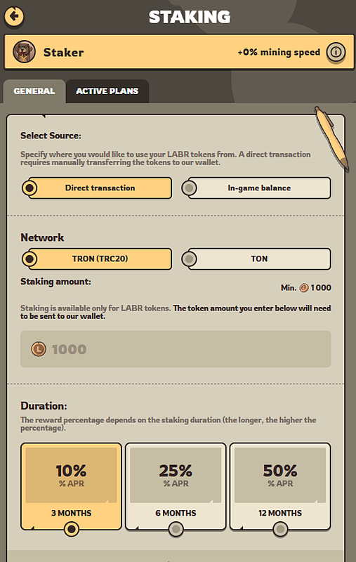 $LABR token staking is available in the game.