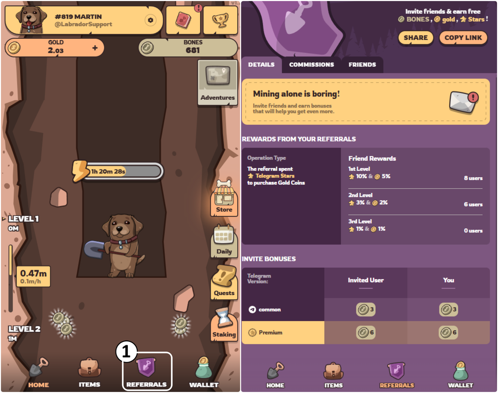 The game features a three-level referral program that allows you to earn by inviting new players.