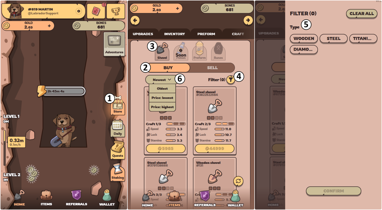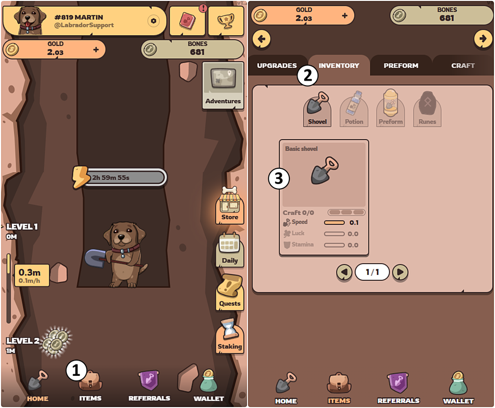 At the beginning of the game, you receive a basic shovel (3) (you can find it under the Items (1) → Inventory (2) tab).