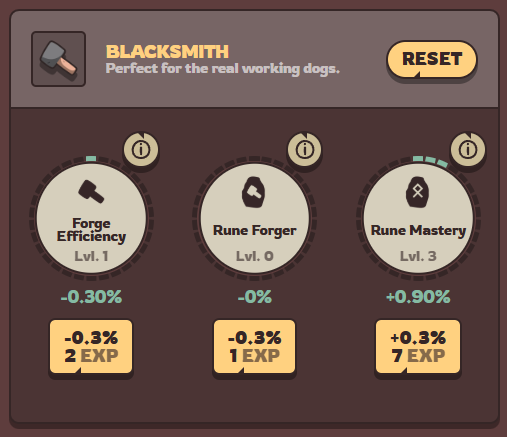 - Blacksmith — affects rune and shovel crafting