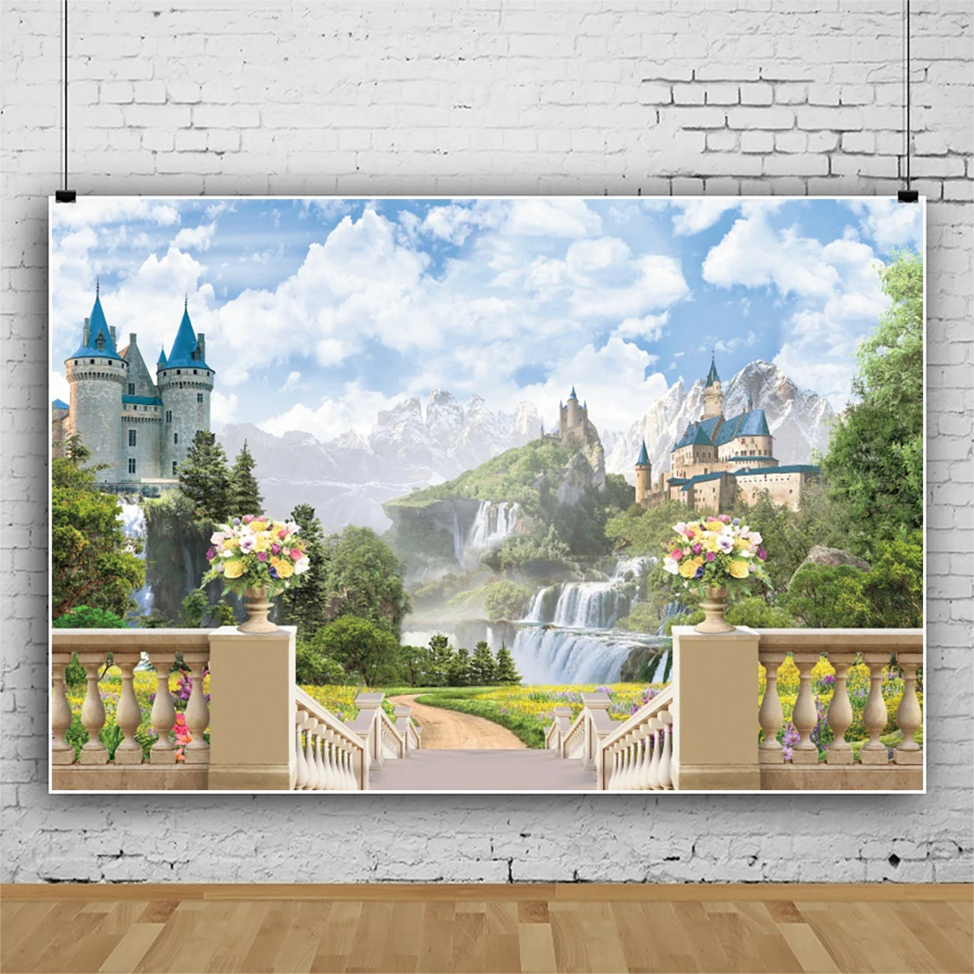 "Laeacco Wedding Backdrops Spring Landscape Cloudy Sky Castle Waterfall Trees Flower Railing Bridal Shower Photography Background" * Buy Now Just For 4$