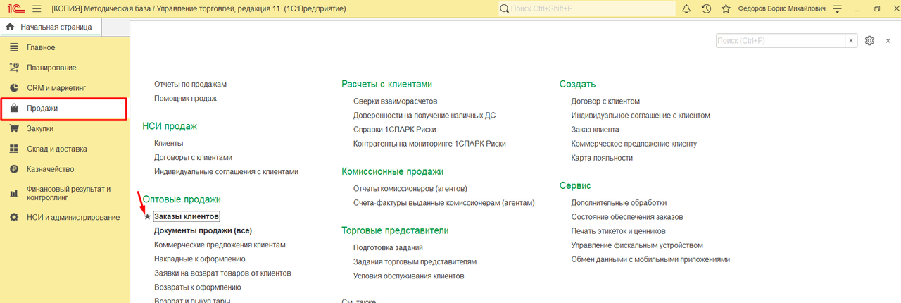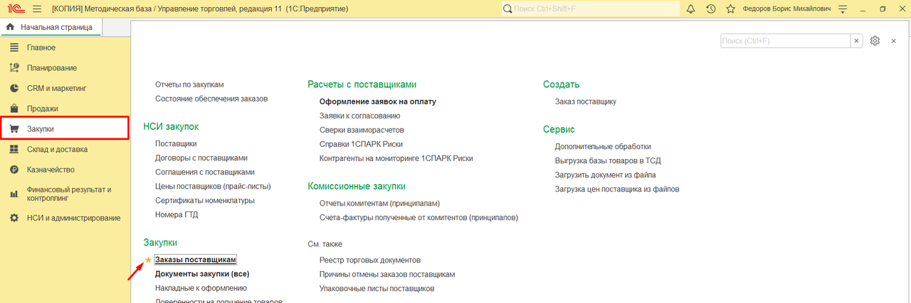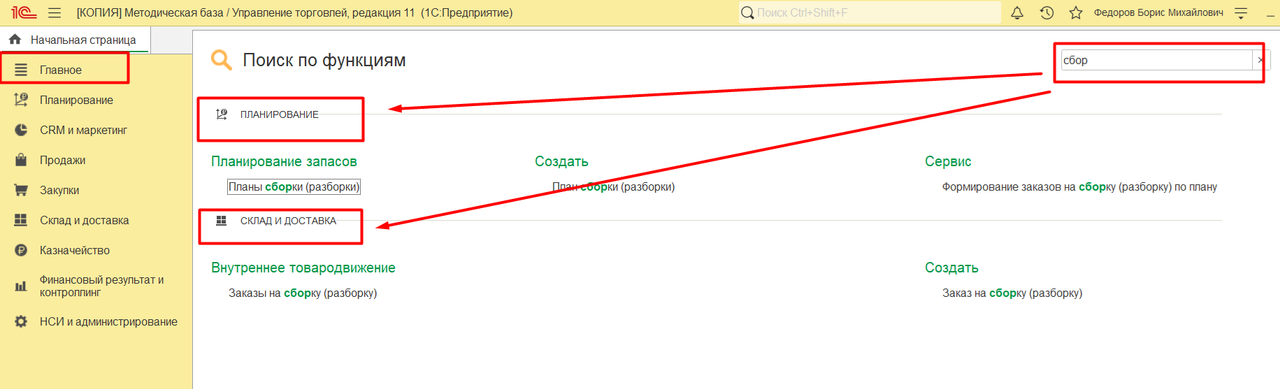 4. Если вы забыли в каком разделе находится нужный документ / справочник / обработка, просто введите название слова, которое есть в названии объекта в поле поиска в правом верхнем углу любой подсистемы программы - Главное / Продажи, Закупки и т.д. Программа выполнит поиск объектов по всем разделам.
