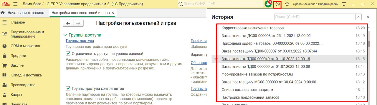 - Если вы случайно закрыли документ или любой другой объект базы, то можно быстро его найти подобно ссылкам в истории браузера: