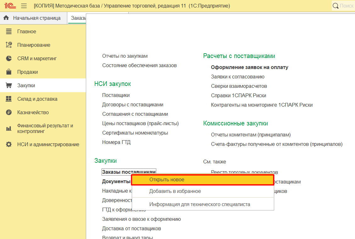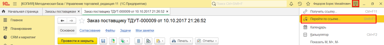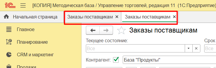 2. Вы можете открыть один и тот же журнал документов/обработку с разными настройками в одном сеансе базы. Для примера возьмем журнал Заказов поставщику в конфигурации УТ: