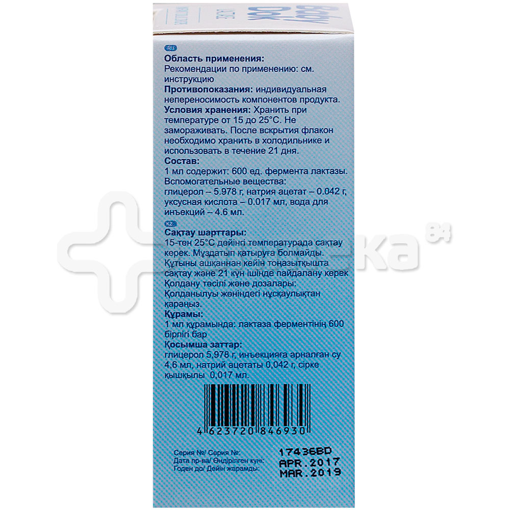 Ціни в аптеках Склад: (в 1 мл): лактаза — 0,6 г, калію хлорид — 0,00932 г, гліцерин — 0,25 мл, вода очищена — до 1 мл . 1 мл розчину крапель містить 3000 ALU лактази . .