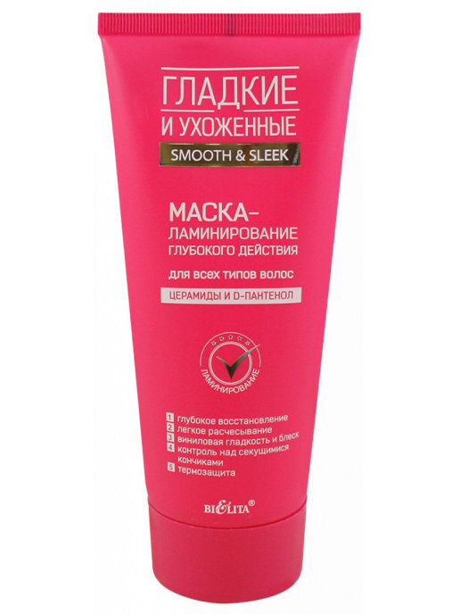 Маска-ламинирование из серии Smooth&Sleek белорусского производителя подходит для разных типов волос и может применяться в качестве термозащиты . В составе маски глицерин, масла зародышей пшеницы и кокоса, которые и оказывают ухаживающий эффект . Волосы после использования приобретают блеск и гладкость . Примерная стоимость - 150 рублей .