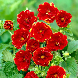 Лапчатка Arc-en-Ciel Описание Лапчатка непальская Arc-en-Ciel Высота растения - до 40 см . Красиво цветущее многолетнее растение с темно-зелеными пальчатыми листьями, похожими на листья земляники . Цветы махровые, яркие, красные с неравномерной желтоватой каймой . Цветет очень обильно и продолжительно с июня по сентябрь .