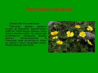 Лапчатка снежная растение : Семейство розоцветные . Стержнекорневой травянистый многолетник . Селится на гольцах, на основных . . .