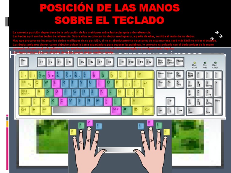 La posición de las manos . El siguiente paso, tras haber leído las tres claves de la mecanografía, es aprender a colocar las manos y dedos en el teclado . Observa atentamente la siguiente figura para entender cómo y dónde deben descansar tus manos y dedos en el teclado: Dedo . Mano Izquierda .