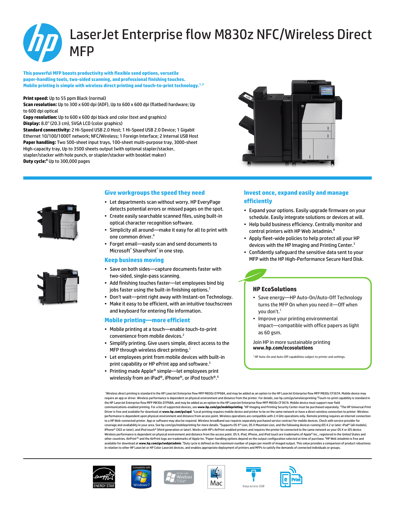 LaserJet Enterprise flow M830z MFP This powerful MFP boosts productivity with flexible send options, versatile paper-handling tools, two-sided scanning, and professional finishing touches . Mobile printing is simple with wireless direct printing and touch-to-print technology .1, 2 Print speed: Up to 55 ppm Black (normal)