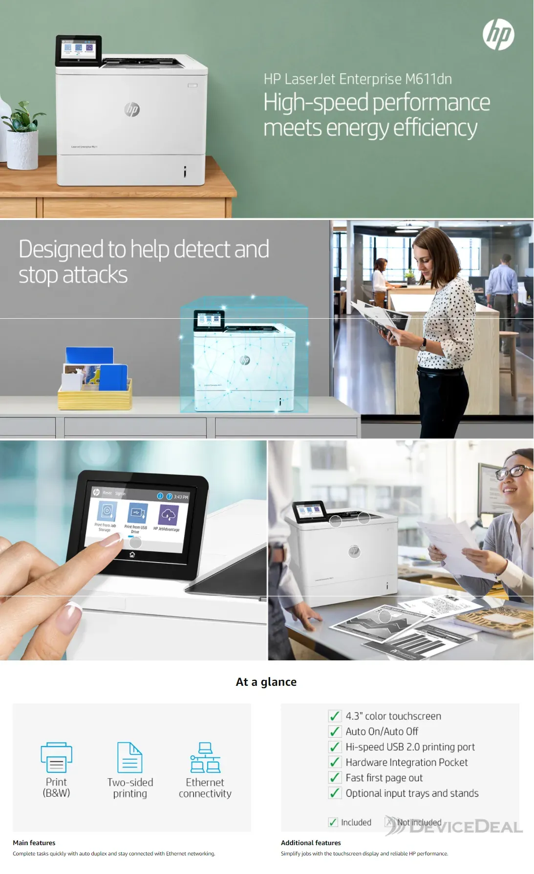 Combine performance, energy efficiency, and security with the HP LaserJet Enterprise M611dn printer—the world's most secure printing . This monochrome duplex laser printer features security solutions that help detect and stop attacks, while also protecting your sensitive business data .