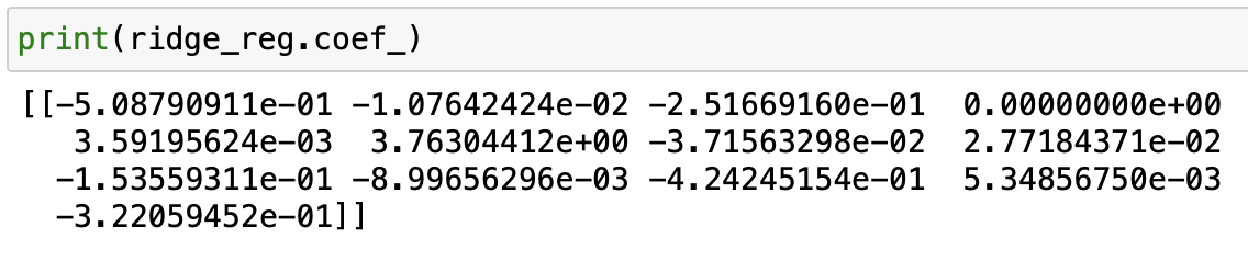 Как видите, коэффициент для RM все еще довольно высок (около 3,76), в то время как все остальные коэффициенты уменьшились. Однако ни один из них не был обнулен, как в случае с лассо-регрессией.