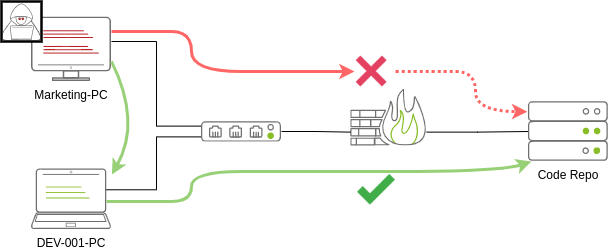 Обратите внимание, что хотя горизонтальное перемещение может потребоваться для обхода ограничений брандмауэра, оно также полезно для уклонения от обнаружения. В нашем примере, даже если рабочая станция отдела маркетинга имела прямой доступ к репозиторию кода, возможно, желательно все таки к репозиторию подключиться через ПК разработчика. Такое поведение было бы менее подозрительным с точки зрения аналитика SOC, отслеживающего журналы аудита входа в систему.