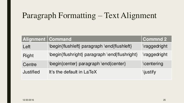 Paragraphs in LaTeX are fully justified, i.e. flush with both the left and right margins. If you would like to change the justification of a paragraph, L a T e X has the following three environments: center , flushleft and flushright (see an example of center at the introduction ).