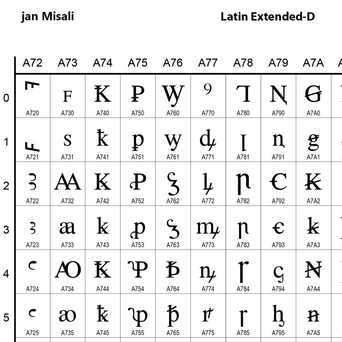 Latin Extended-D is a Unicode block containing Latin characters for phonetic, Mayan, and Medieval transcription and notation systems. 89 of the characters in this block are for medieval characters proposed by the Medieval Unicode Font Initiative.