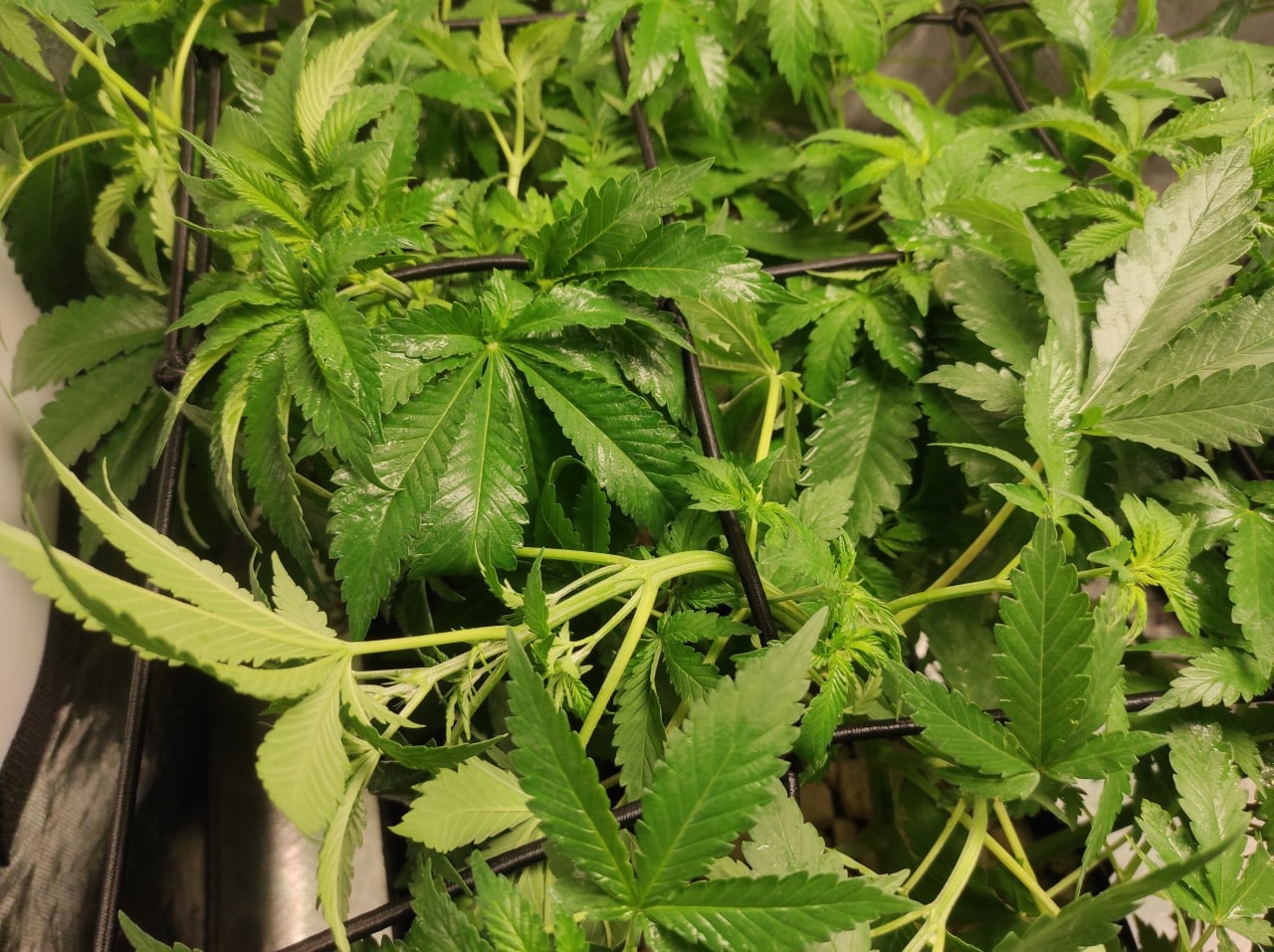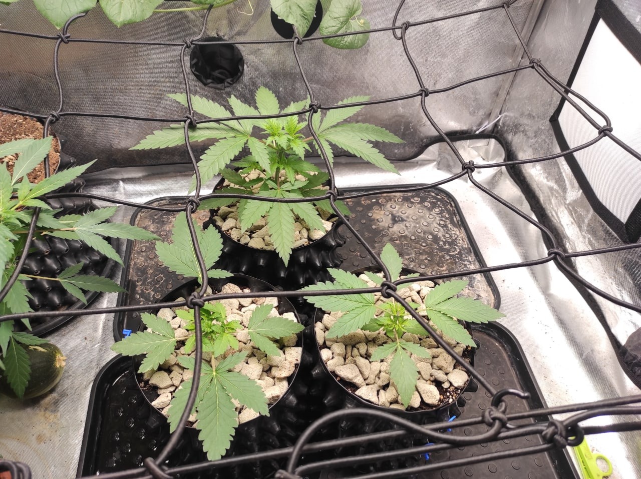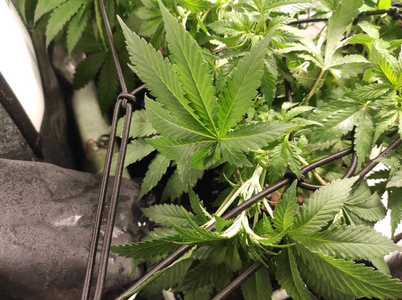 Scrog + Дефолиация и небольшие перестановки, освободить место (ведь у нас скрог, а не просто поддержка растения), более слабая вдова переехала в другое место.