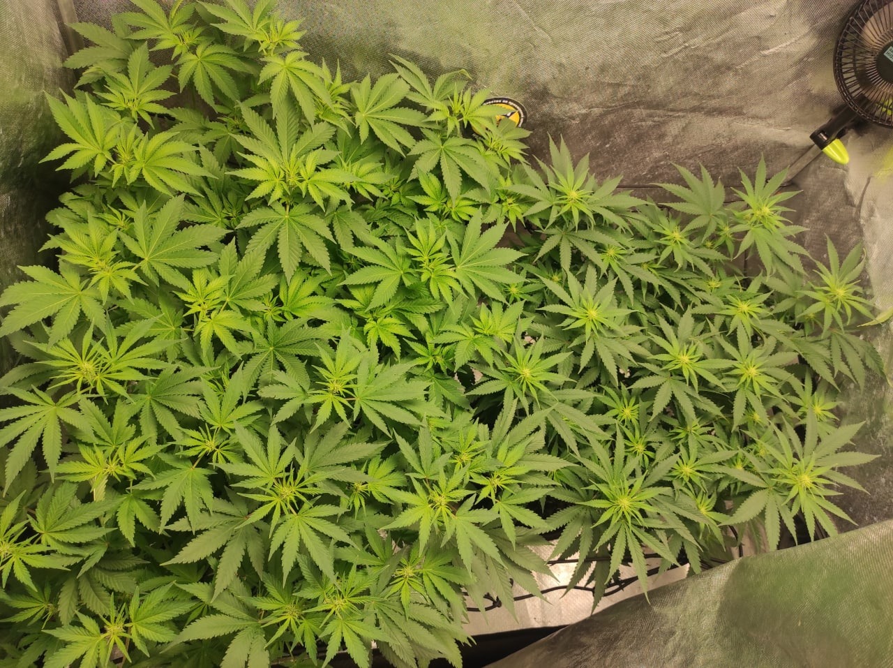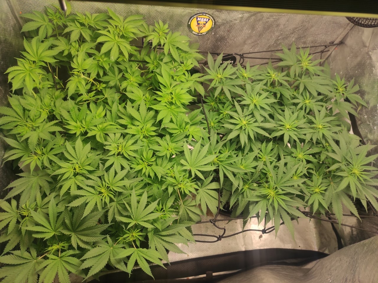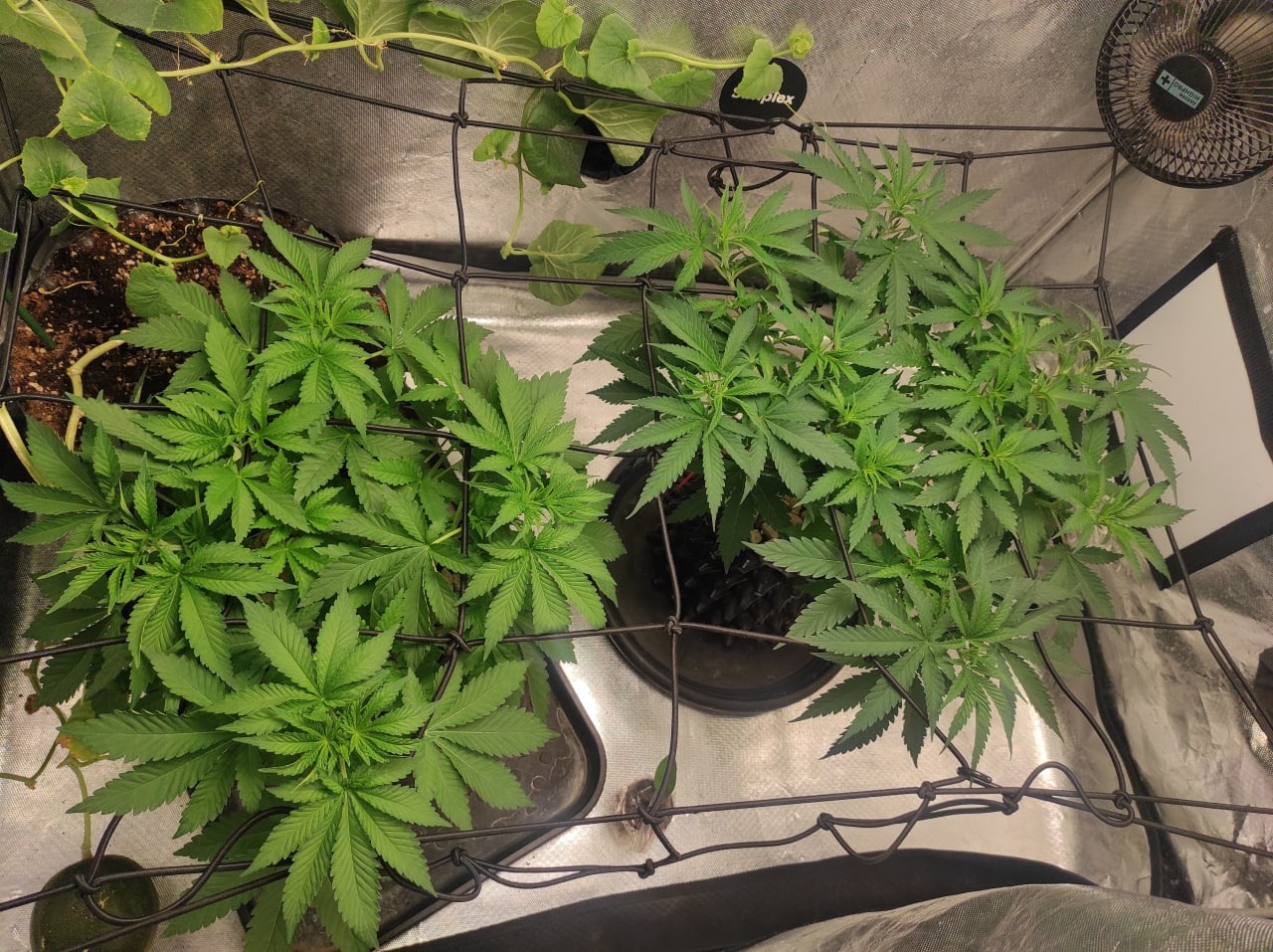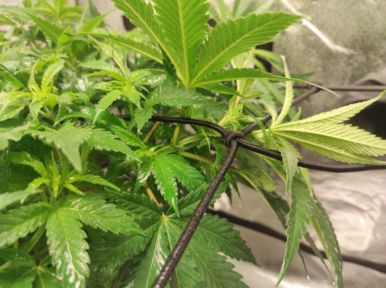 Scrog + Дефолиация и небольшие перестановки, освободить место (ведь у нас скрог, а не просто поддержка растения), более слабая вдова переехала в другое место.