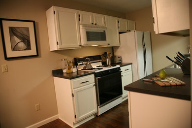 Bill Bailey's kitchen . Bill's kitchen features white walls and wooden cabinets . Crisp white walls and muted cream floor tiles are a staple in Bill's house, including his kitchen .