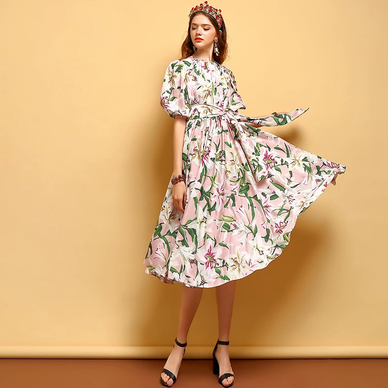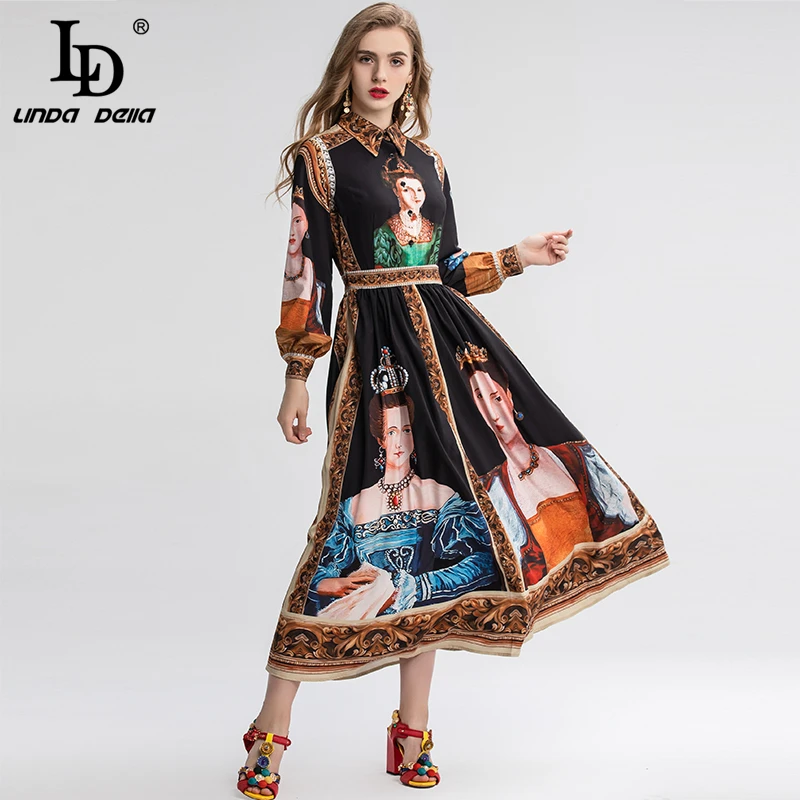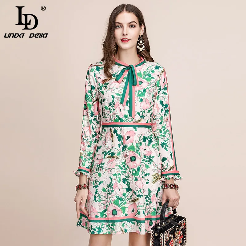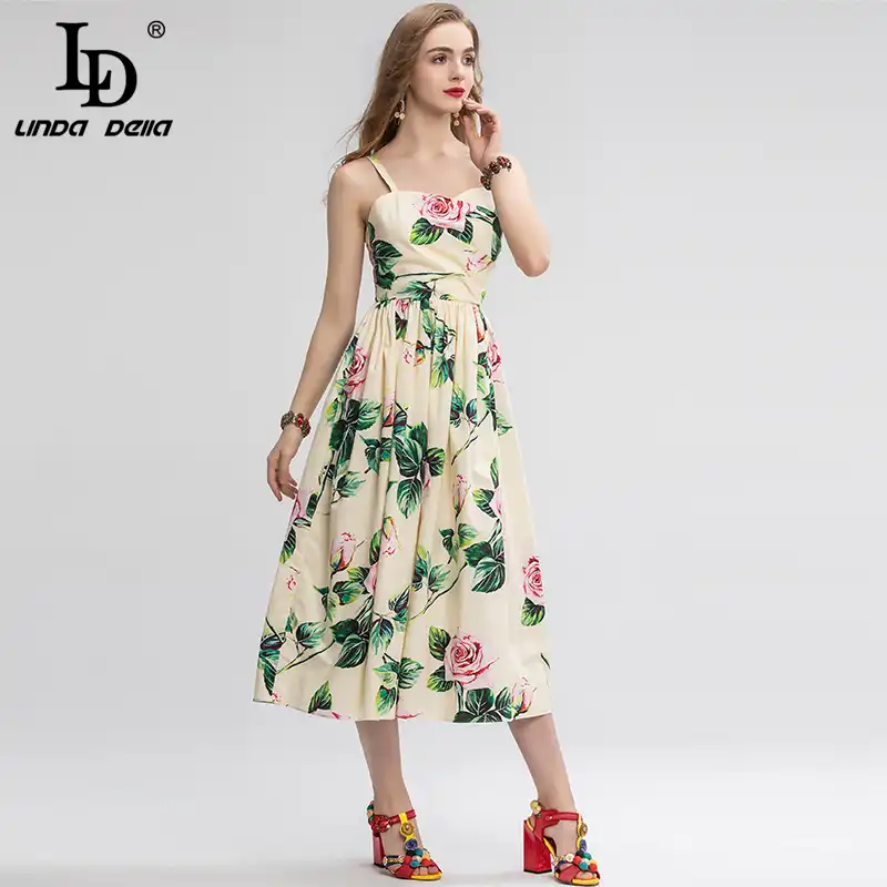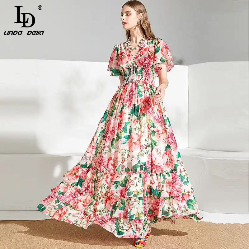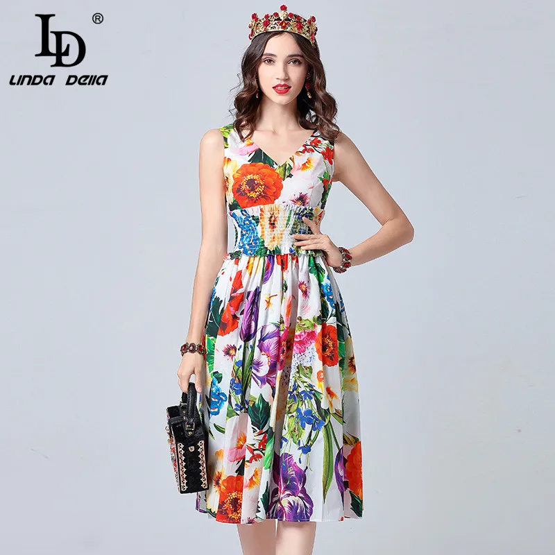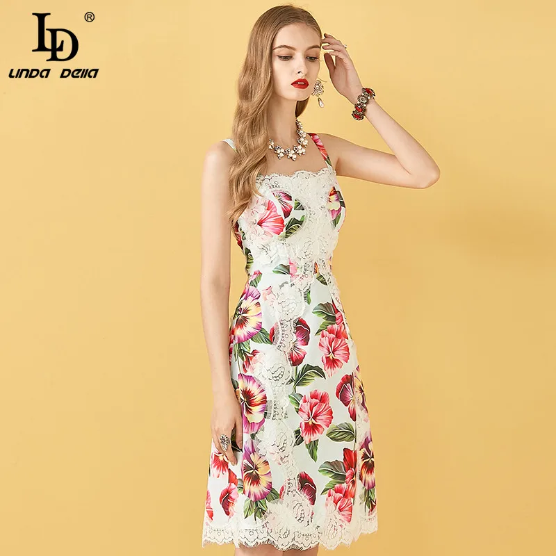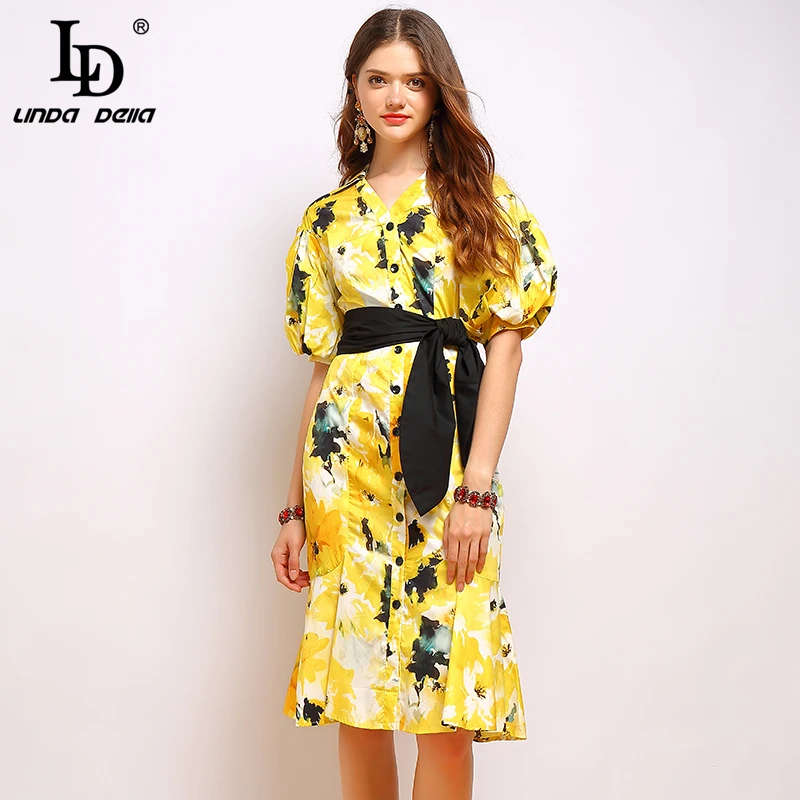 LD LINDA DELLA New Fashion Designer Summer Dress Women's V-neck Lace Puff sleeve Flowers print Vintage Party Midi Dress