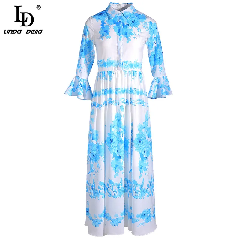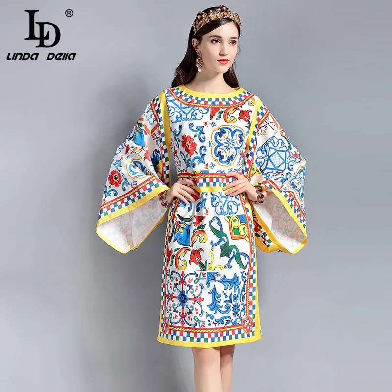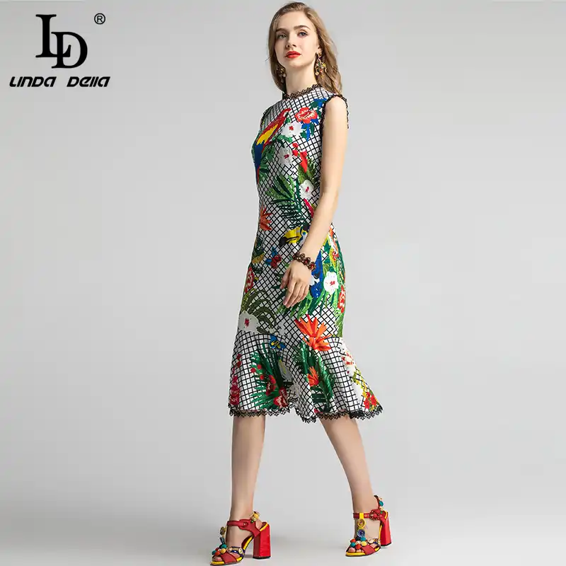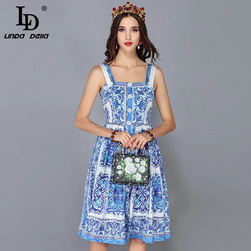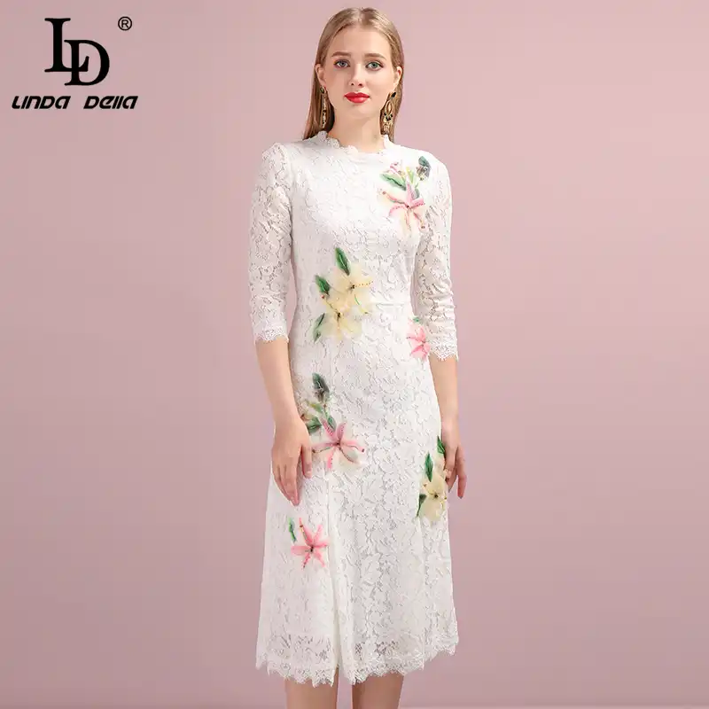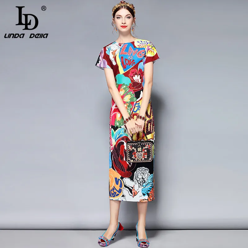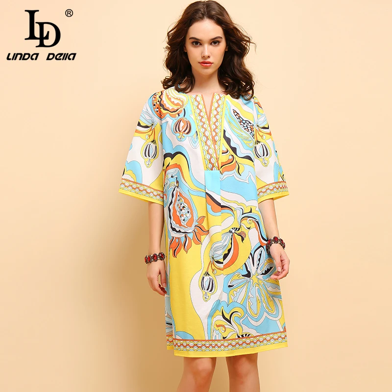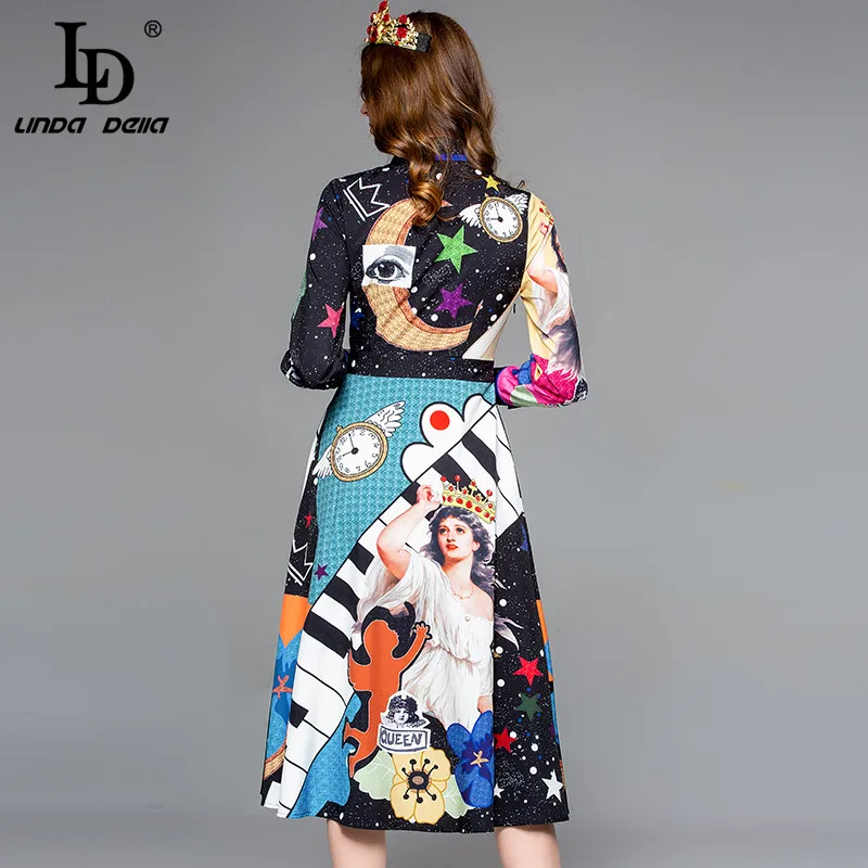 LD LINDA DELLA New Fashion Designer Summer Dress Women's V-neck Lace Puff sleeve Flowers print Vintage Party Midi Dress